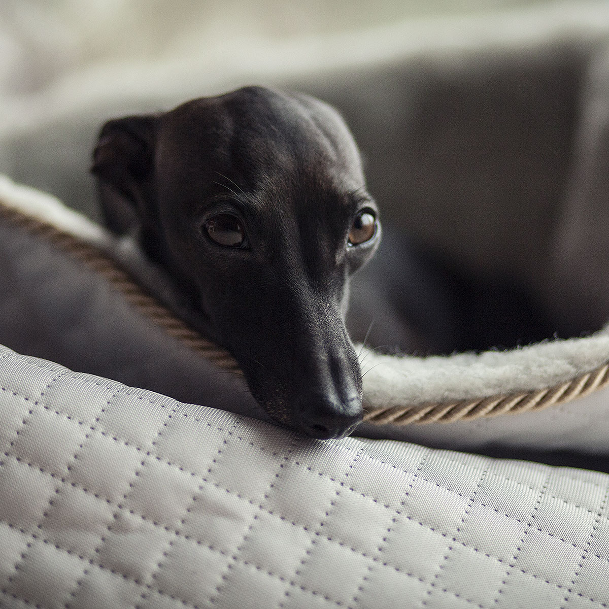 Wyściełany merino i z miękkimi bokami, to legowisko gwarantuje bezpieczeństwo i przytulność, które każdy charcik pokocha.