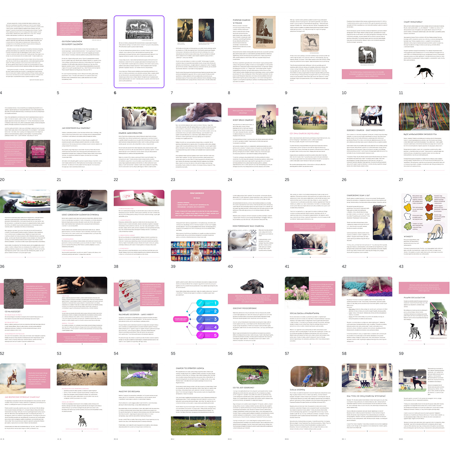 To 130 stron ilustrowanych tekstów, pełnych wskazówek, anegdot i doświadczeń, które Autorka zebrała przez długie lata życia z charcikami włoskimi. Napisana w krótkiej, zwięzłej i przystępnej formie.