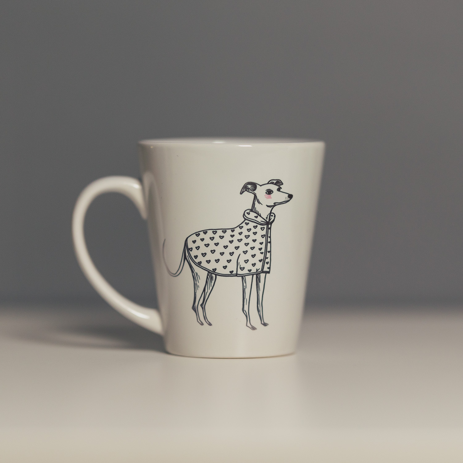 Ceramiczny kubek z ilustracją wkurzonego charcika w płaszczyku w serduszka.