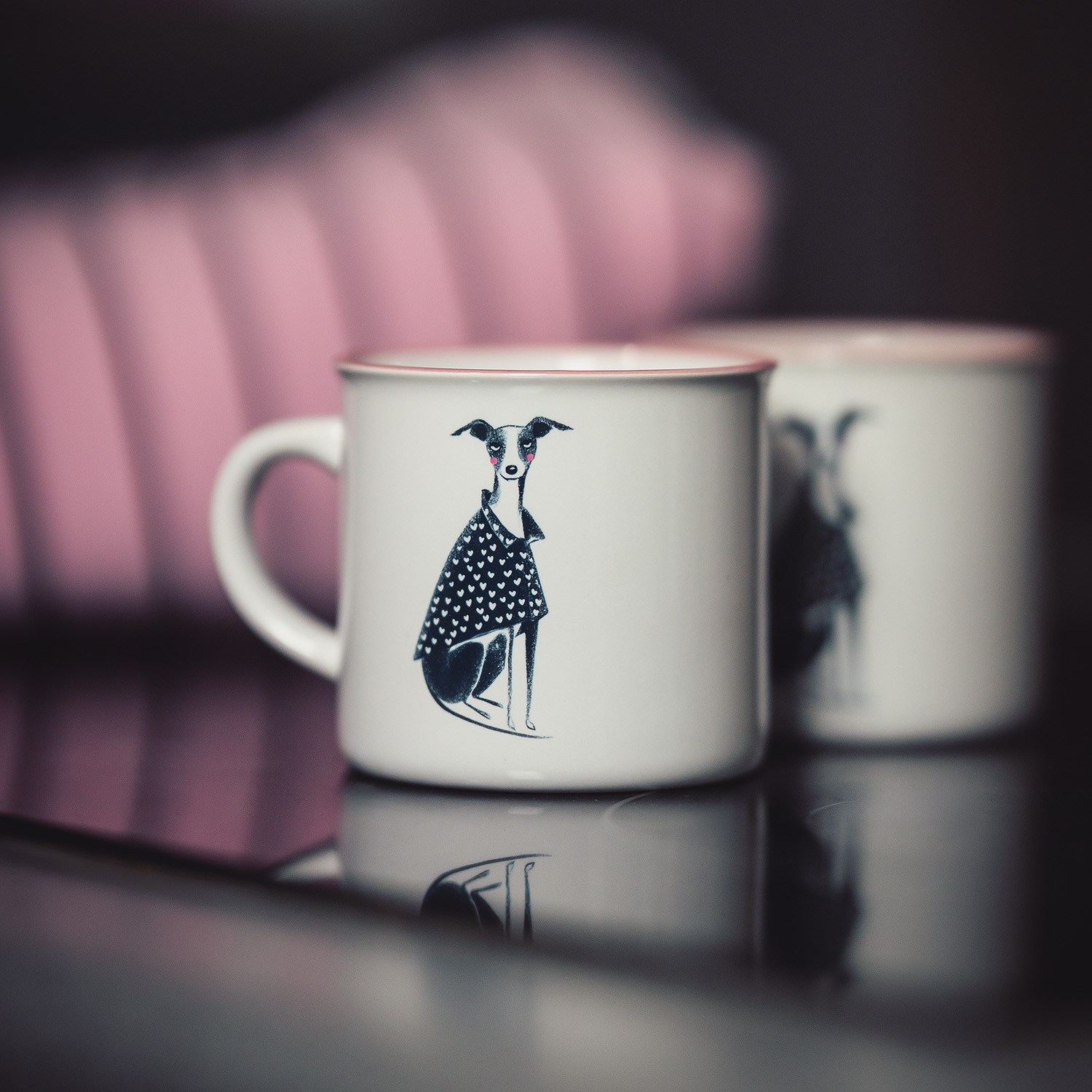Ceramiczny kubek z różową krawędzią i ilustracją siedzącego, słodkiego charcika.