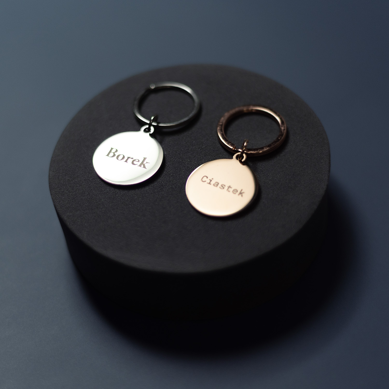 Personalizowana, metalowa adresówka dla charcika w kształcie kółka.