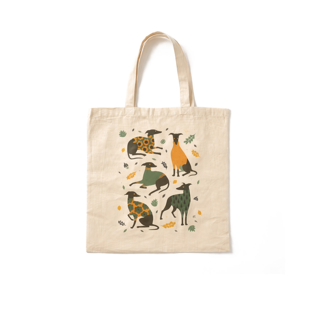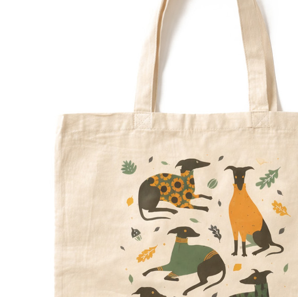 Praktyczna, płócienna torba z motywem charcików, doskonale sprawdzi się jako torba na zakupy albo akcesoria na spacer.