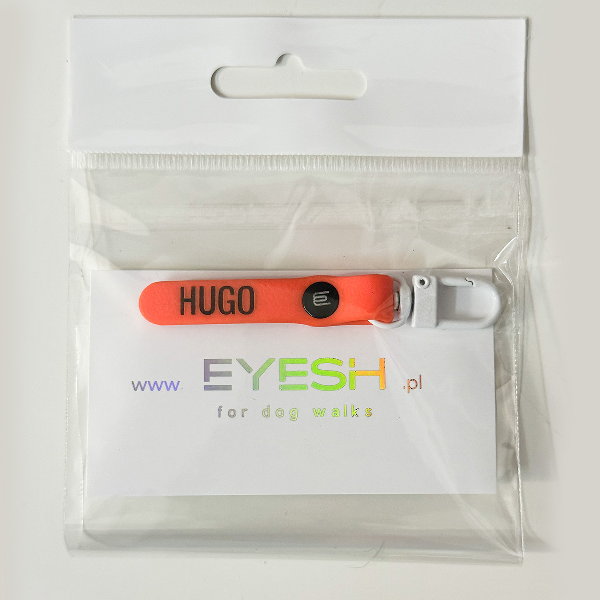 Personalizowana zawieszka z imieniem psa i numerem telefonu właściciela, którą przypina się do obroży bądź szelek. Zawieszona na karabińczyku, dzięki czemu łatwo przepina się pomiędzy obrożami.
