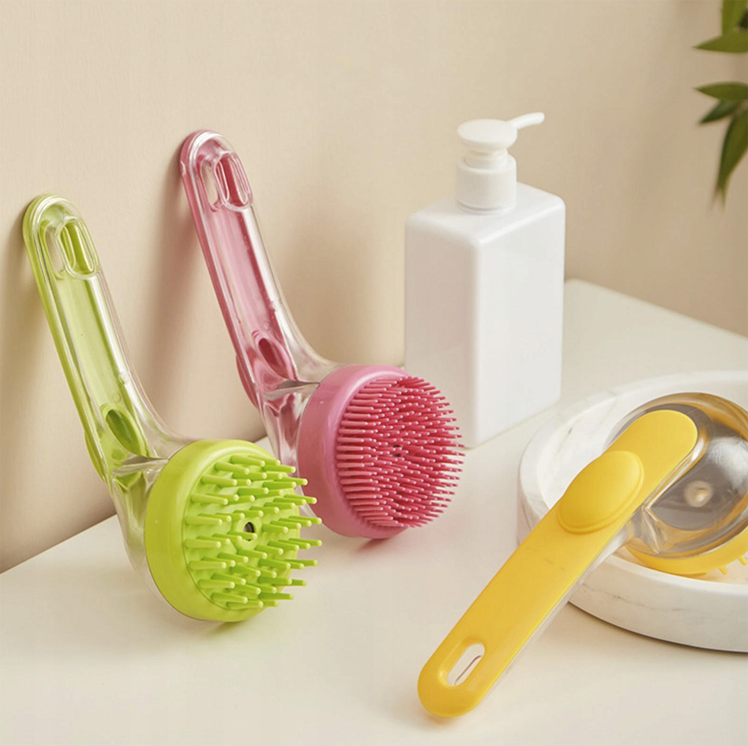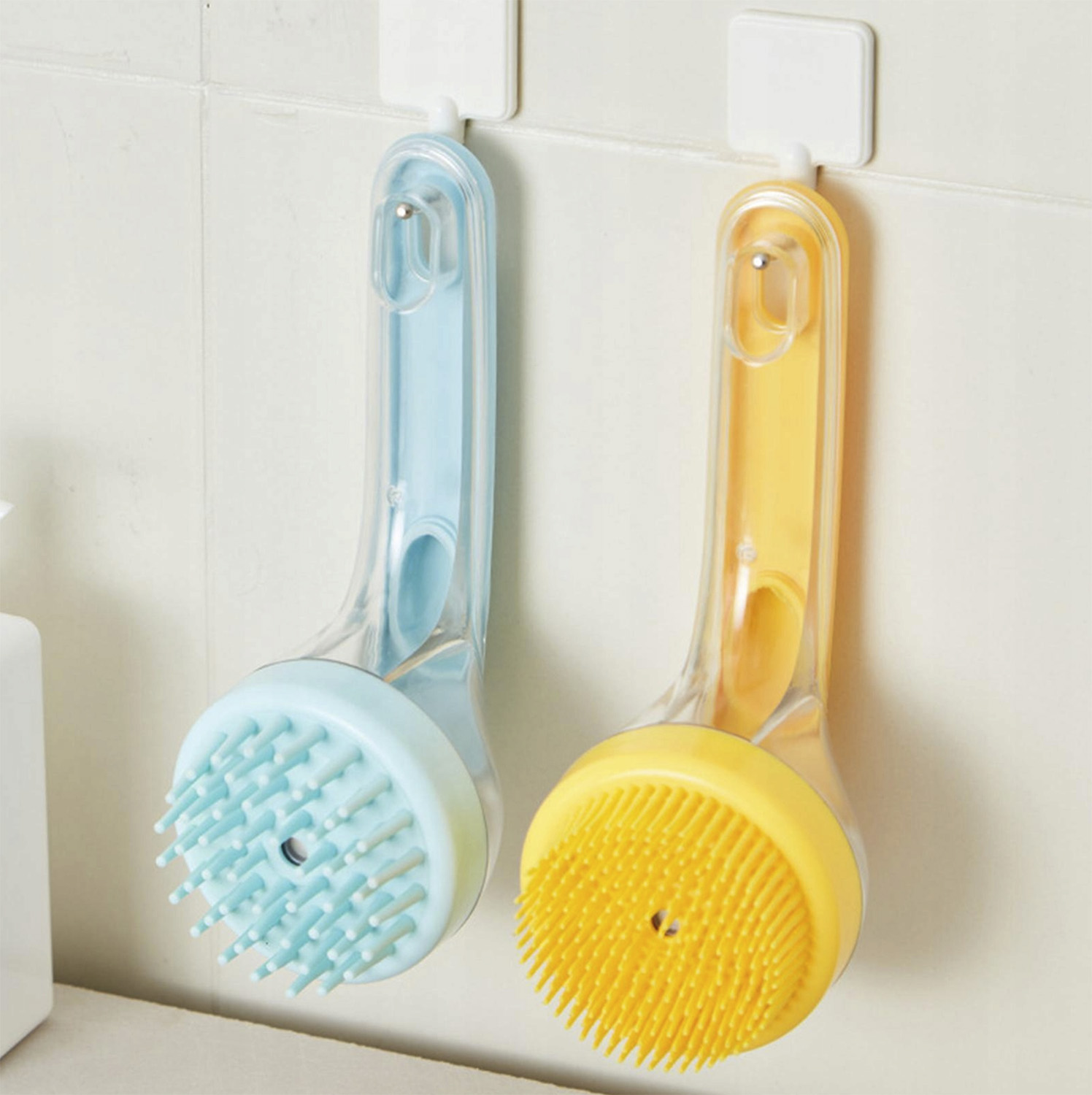 Szczotka do kąpieli psa z wygodną rączką, wbudowanym pojemnikiem na szampon i pompką, która go dozuje.